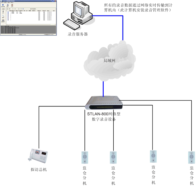 將多臺STLAN接入局域網(wǎng),為每一臺設(shè)備分配一個(gè)固定的IP地址,從電話線路上截取信號,錄音服務(wù)器安裝錄音軟件,即可實(shí)現(xiàn)錄音等操作??蛻舳藷o需安裝任何軟件即可通過web方式對服務(wù)器進(jìn)行訪問。