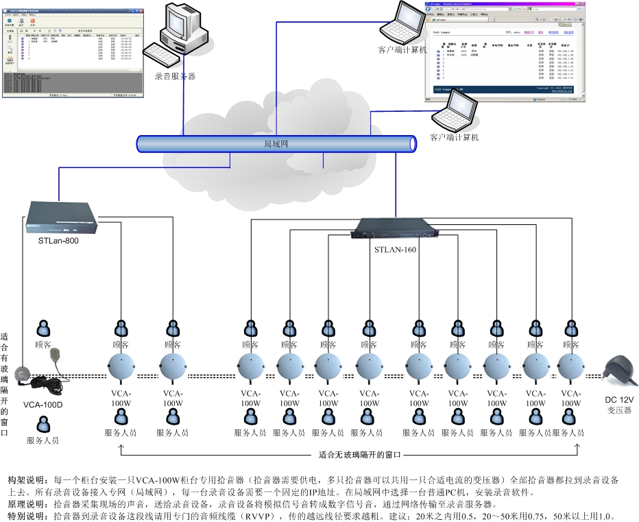 在每一個(gè)窗口或者柜臺(tái)放置一個(gè)拾音器,從機(jī)房布2芯RVVP音頻專用線纜,連接拾音器的對(duì)應(yīng)線纜,機(jī)房這頭連接STLAN網(wǎng)絡(luò)型數(shù)字錄音設(shè)備的音頻輸入接口,從機(jī)房布2芯電源線纜或者就近取電。通常采用集中供電方式,一個(gè)合適的電源可以同時(shí)給數(shù)個(gè)VCA-100W拾音器供電。安裝軟件,并且進(jìn)行配置。