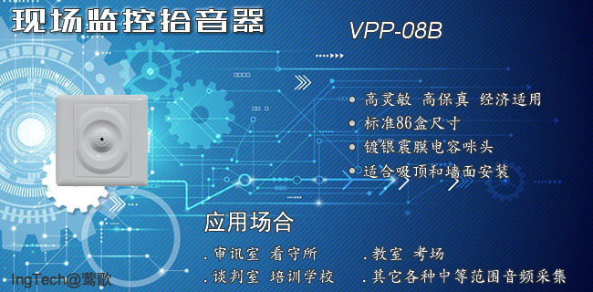 本款拾音器適應于銀行、監(jiān)獄、考場、商場、工業(yè)生產(chǎn)等多種監(jiān)聽拾音場所,具有噪聲小、保真度高、工作電壓范圍寬、耗電小、傳輸距離遠等優(yōu)點。VPP-08B是一種新型靈敏度可調節(jié)的拾音器,是電視監(jiān)控、安防系統(tǒng)配套使用最理想的產(chǎn)品,本拾音器和攝像機配合使用實現(xiàn)視音頻同步。