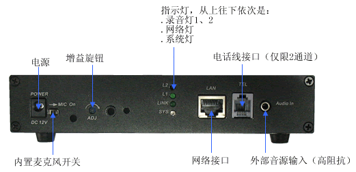 基于它嵌入式的運行方案,使得它能靈活適用除電話線路以外的多種模擬信號音的錄制,諸如調(diào)音臺、功放、對講機、無線電臺、拾音器等等。
