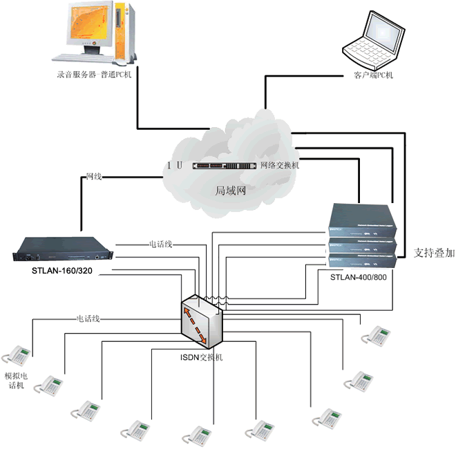 錄音存儲服務(wù)器與STLAN硬件通過標準TCP/IP協(xié)議網(wǎng)絡(luò)相連,因此不受限于服務(wù)器存放位置,錄音設(shè)備可以放在任何有網(wǎng)絡(luò)接口的地方。